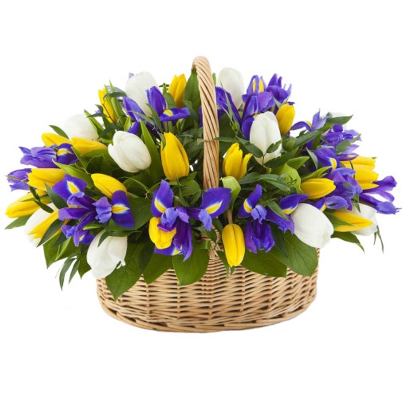 Корзина из тюльпанов и ирисов "Фиеста"