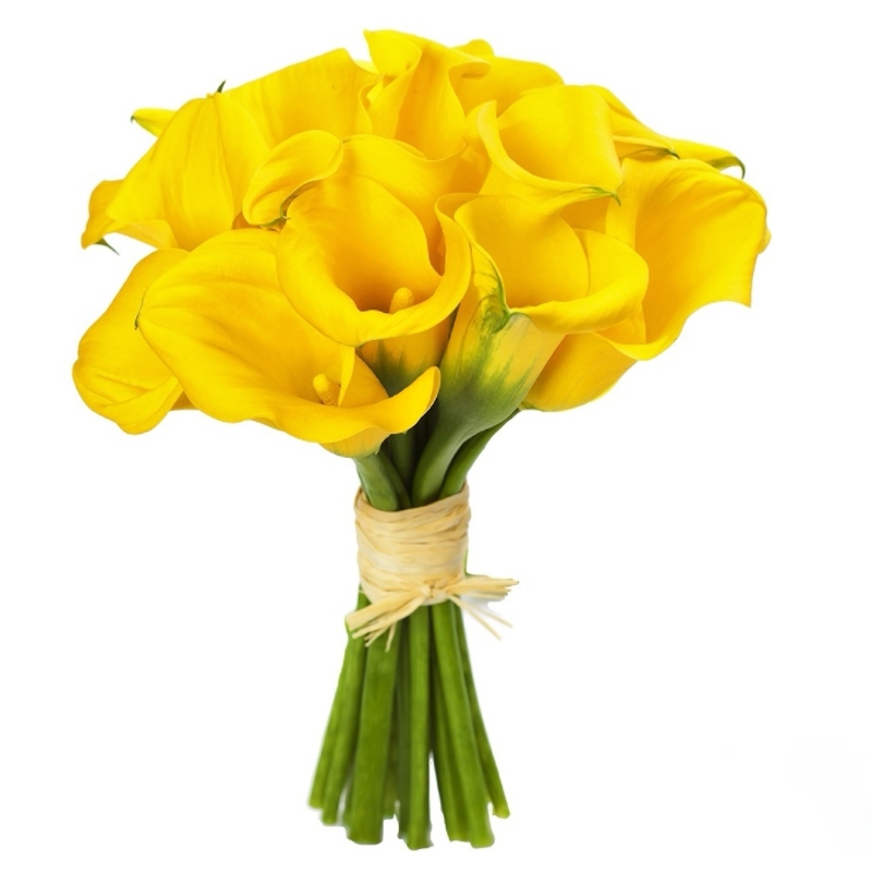 Букет состоит из 15 желтых калл, прозрачная упаковка, лента.