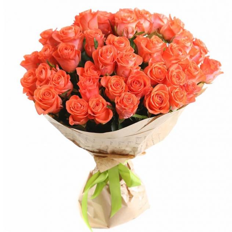 Букет состоит из 45 коралловых роз, крафт, атласная лента.