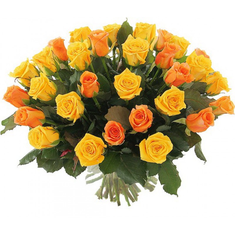 Букет состоит из 16 коралловых роз, 15 желтых роз, прозрачная упаковка, атласная лента.